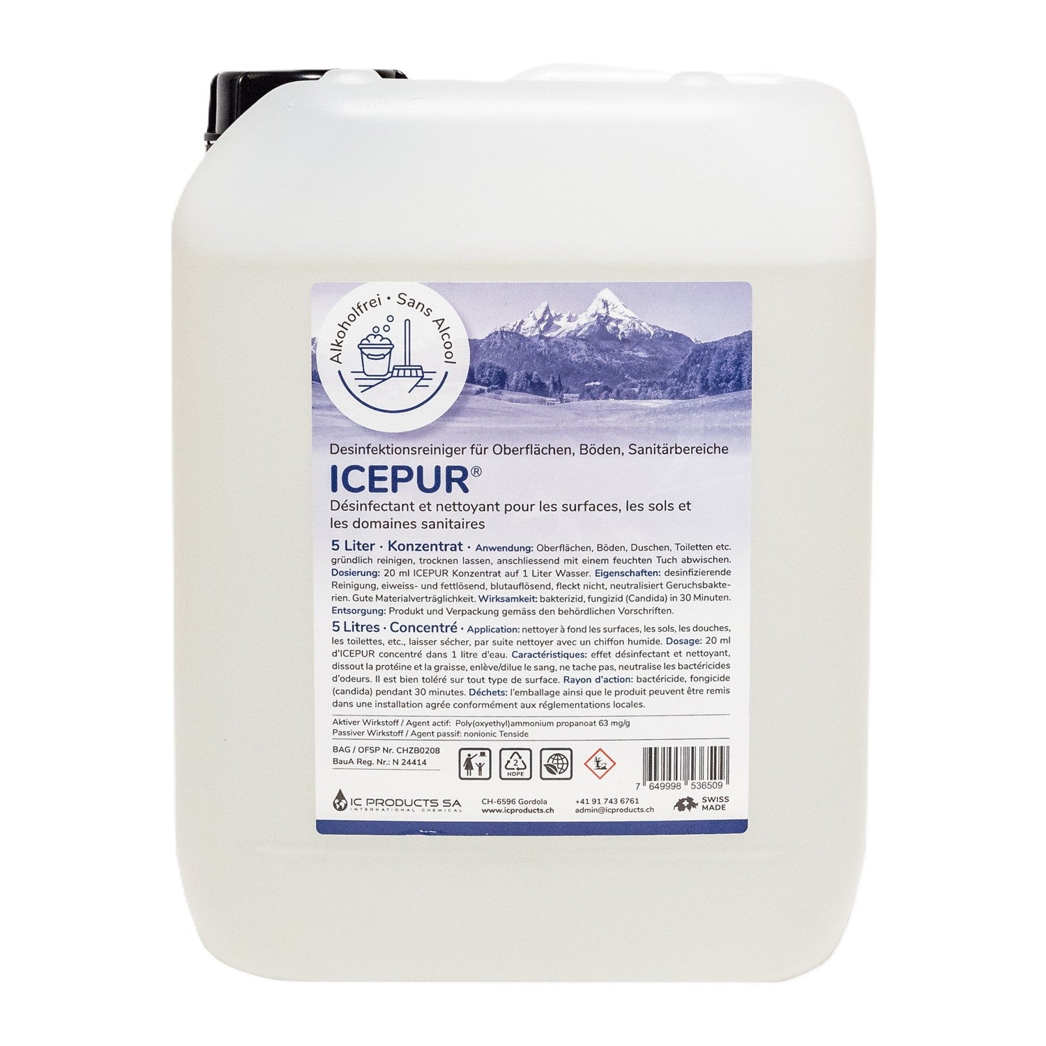Icepur djeluje baktericidno, fungicidno (Candida), algecidno i selektivno virucidno. Otapa proteine i masti, neutralizira bakterije neugodnog mirisa i ima dobru kompatibilnost s materijalima. Ne sadrži otrovne niti hlapljive komponente pa se može koristiti iu zatvorenim prostorijama.